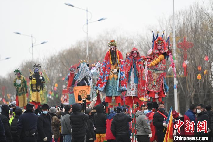 2月21日,兰州市永登县高跷社火演绎“空中杂技”。李亚龙 摄