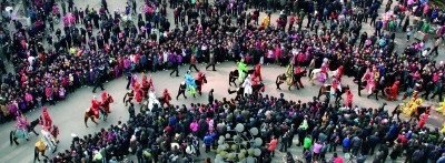 社火队伍的巡游表演吸引众多乡亲前来观看。