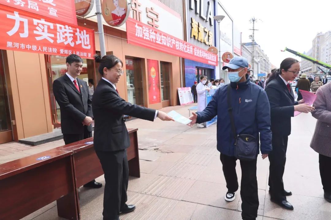 黑河中院在健全知识产权审判机制的同时,还加强知识产权普法宣传,在第24个世界知识产权日即将来临之际,开展系列普法宣传活动。组织全市两级法院开展知识产权讲座,联合市知识产权局走上街头,发放知识产权科普手册,认真解答群众提出的法律问题,普及知识产权法律知识,正确引导人民群众树立品牌理念、拒绝假冒伪劣商品、形成知识产权保护意识,营造诚实守信、公平竞争、尊重知识、尊重创造的社会氛围。宣传活动共发放相关资料近百册,受到广大群众的一致好评。