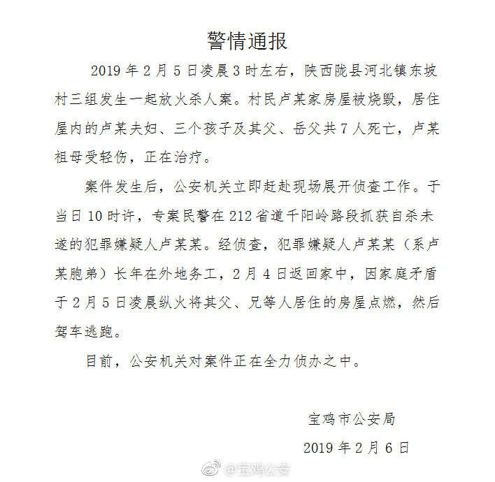 西部网宝鸡讯  2月6日晚上,记者从宝鸡市公安局了解到,2月5日凌晨3时左右,陕西陇县河北镇东坡村三组发生一起放火杀人案。村民卢某家房屋被烧毁,居住屋内的卢某夫妇、三个孩子及其父、岳父共7人死亡,卢某祖母受轻伤,正在治疗。