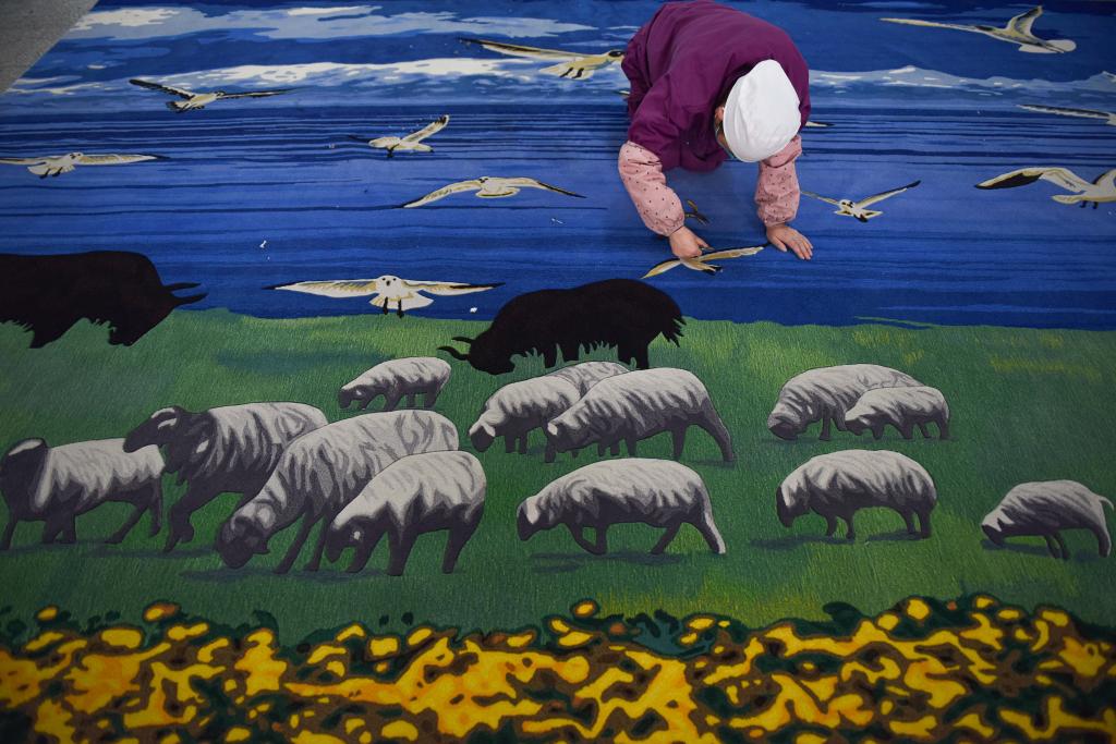 2024年3月20日,新华社外籍记者达莎在西宁市圣源地毯集团生产车间参观。新华社记者赵宇摄