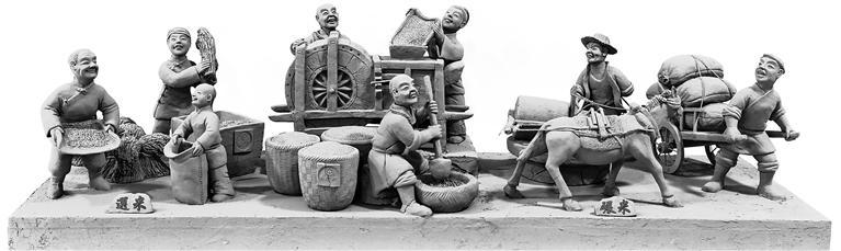 《百年黄酒·五山池》系列,展现出非物质文化遗产五山池黄酒酿造技艺的制作流程,包括碾米、杵米、浸米、洗米、煮饭、拌曲、压榨、出酒、调酒等21道工序,用7组劳动场景、53个人物和榨厢、酒海、碓臼、碾子、风车、骡马等,展示古法酿造全过程。