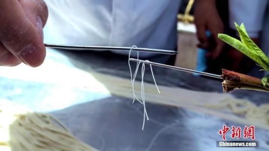 图为化隆拉面匠人展示拉面技艺。李隽 摄