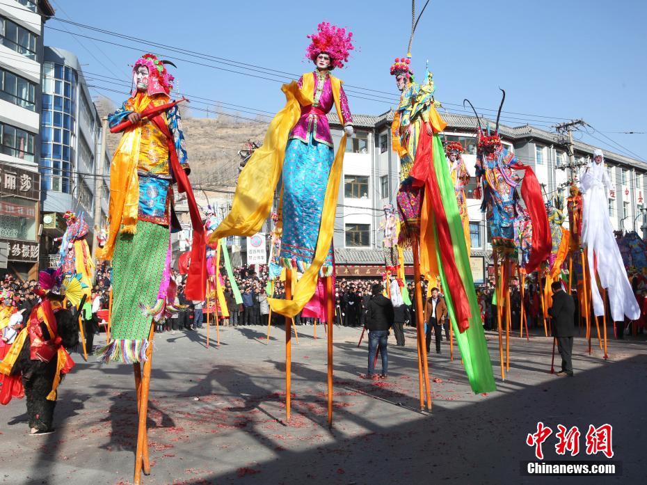 2月27日,青海省湟中县鲁沙尔镇社火展演中的高跷表演吸引观众目光。这支高跷队由70多名成员组成,今年高跷高度突破3.6米。据悉,高跷自明代洪武年间从中原地区传入湟中鲁沙尔地区,距今已有600多年历史。鲁沙尔是青海地区最早表演高跷艺术的地方,2008年11月文化部命名鲁沙尔镇为中国民间文化艺术(高跷)之乡。中新社记者张海雯 摄