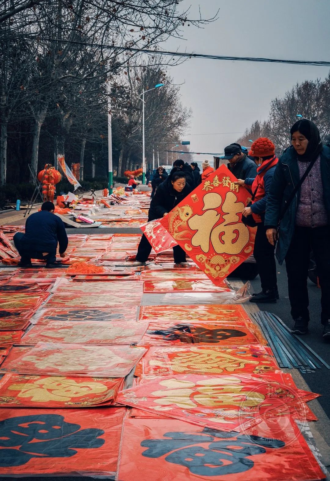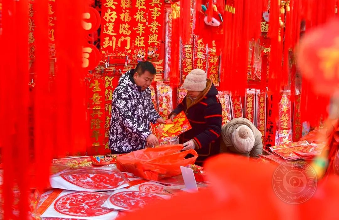 2024年2月19日,拍摄于山东济宁。春节前夕家家户户买对联为春节做准备,一份份“福”在传递在集市场的热闹当中。