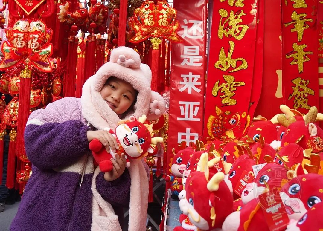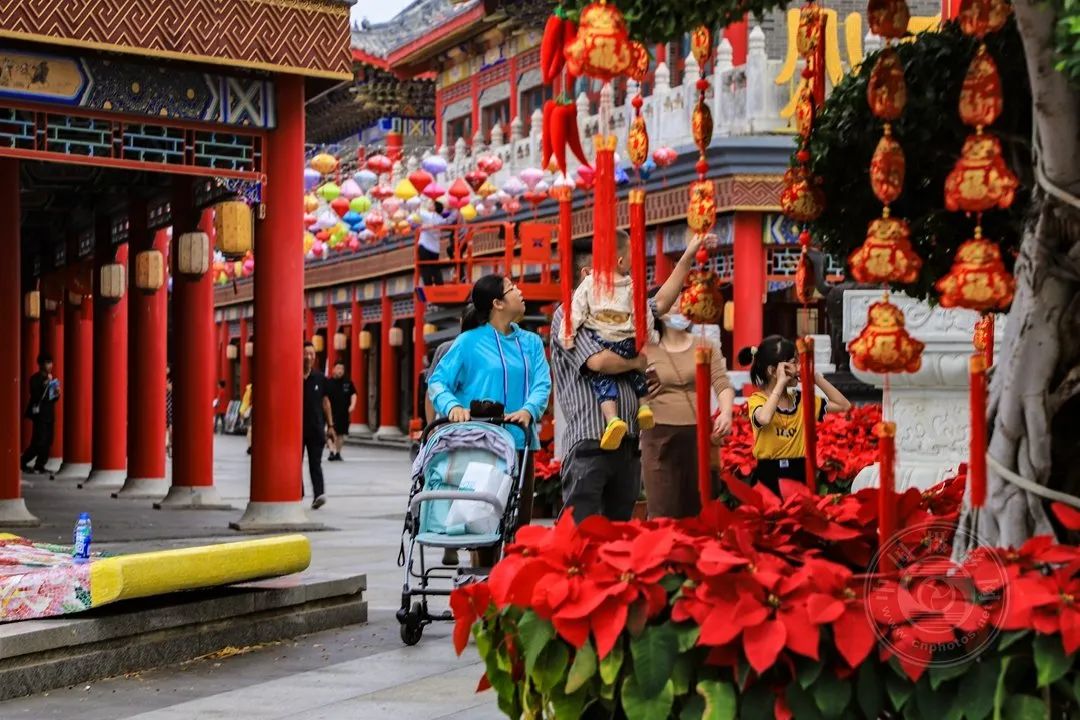 2024年2月6日,拍摄于海南。一家人春节期间逛街,到处是红色的海洋,中国红吸引了一家人的目光。