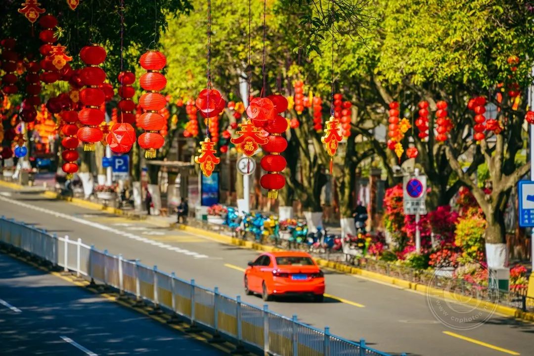 2024年2月10日,拍摄于福建漳州芗城区街道。挂满灯笼的街道,为回家过年的车辆增添一丝的年味。