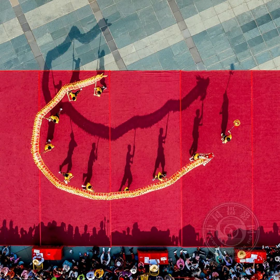 2024年2月14日,拍摄于广东江门。龙年正月初五,阳光灿烂,一场龙狮武术邀请赛正如火如荼地进行中,舞龙队的表演精彩纷呈,阳光把腾龙、舞师、观众、评委的影子拉长,光影效果让画面更生动和欢乐。