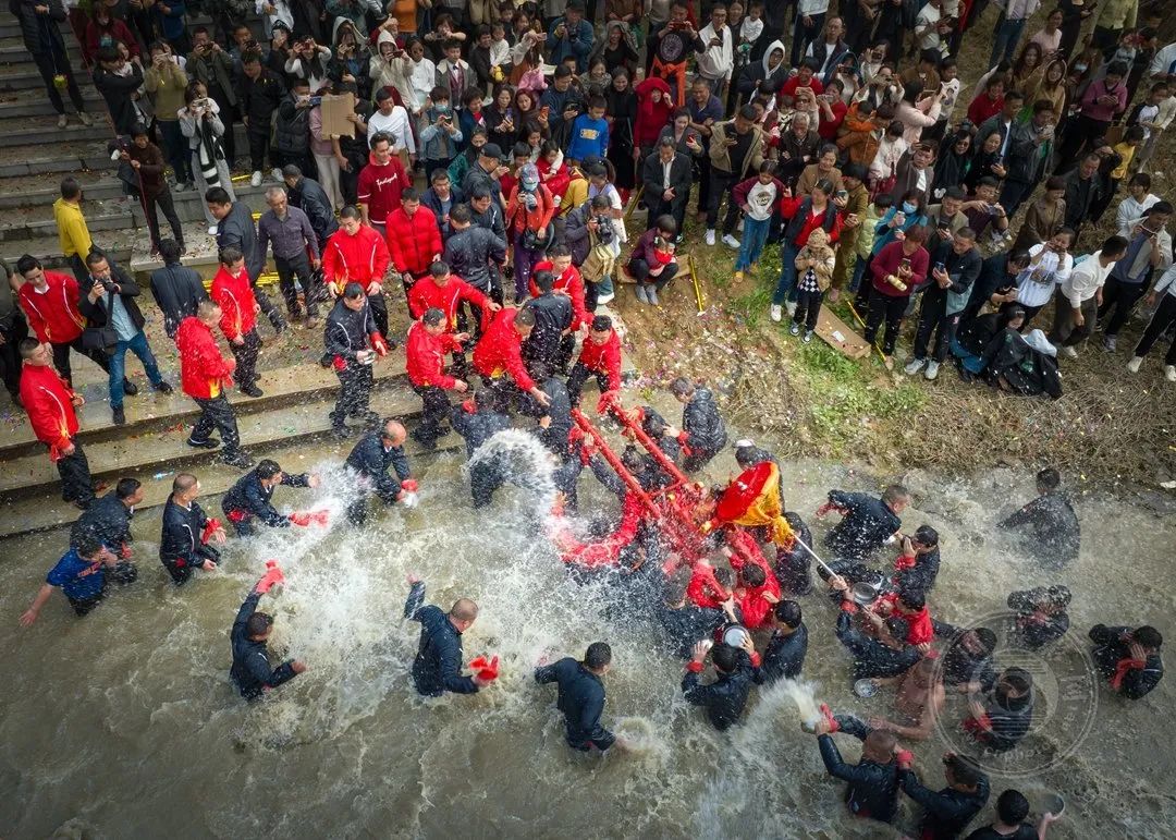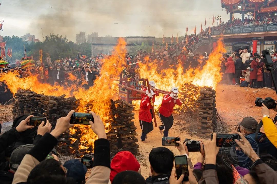 2024年2月25日,拍摄于福建莆田。村民年轻人抬着神像,赤着脚,在熊熊大火中穿越,祈福吉祥安康。