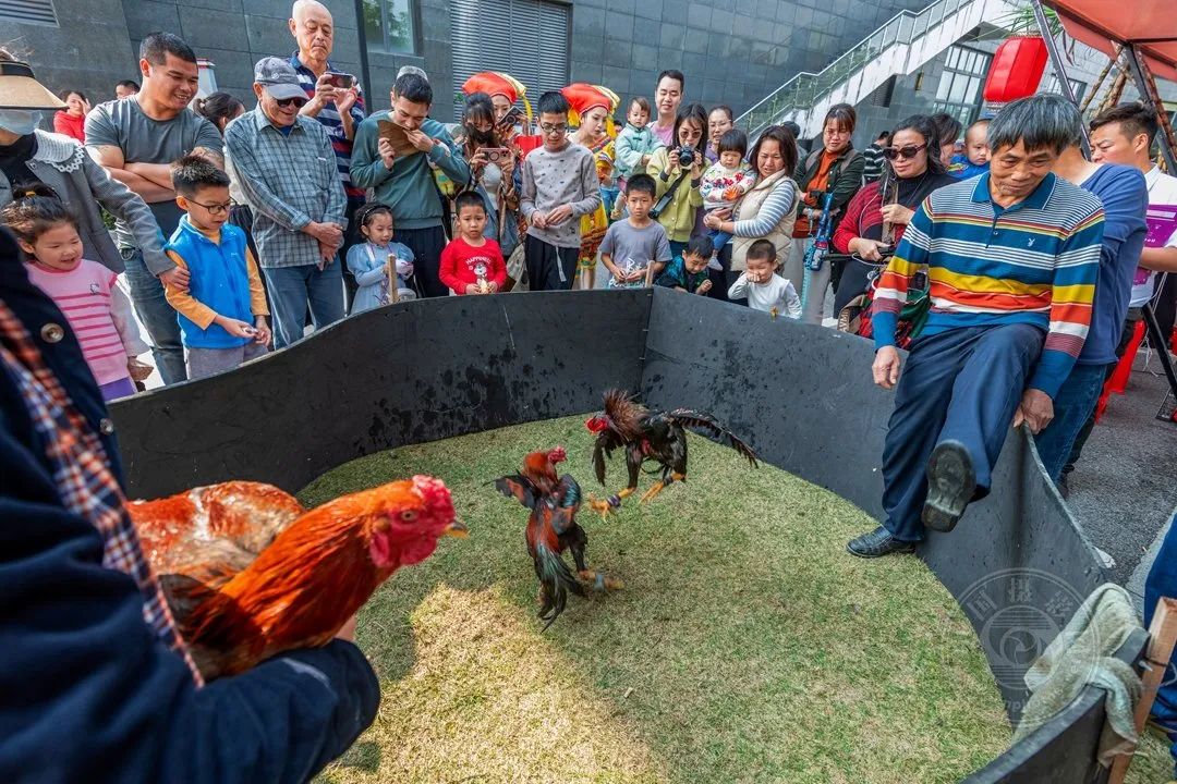 2024年2月3日,拍摄于广西合浦县月饼小镇。春节将至,合浦月饼小镇举办“海丝非遗大集市”活动,图为精彩纷呈的斗鸡表演为当地迎接龙年春节的到来增添不少情趣。