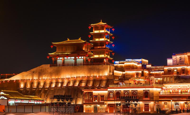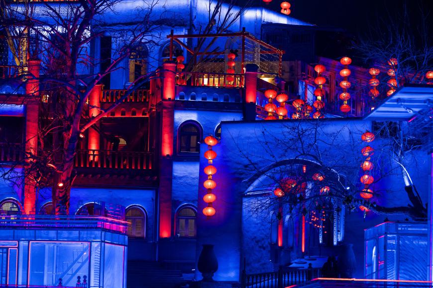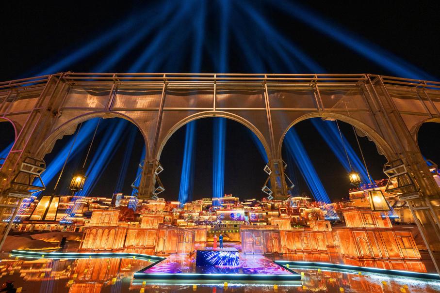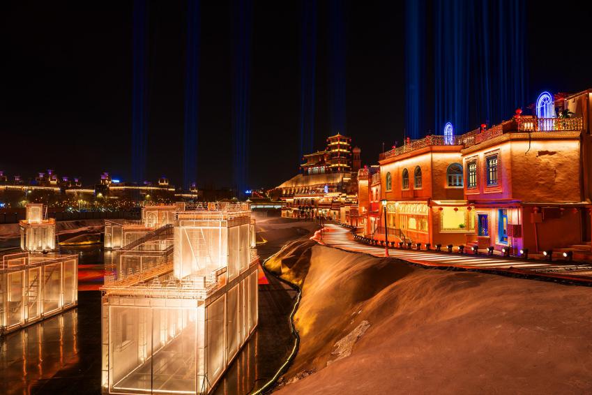 中华民族传统节日春节是百姓的节日,为了全面呈现新疆的过去、现在和未来,主创团队在舞美设计中以“生活之上”为主题,集中体现以民为贵、与民同庆的亲民理念。以“活着的历史文化名城”——喀什古城为背景,依托百姓休闲娱乐的九龙泉湿地公园搭建舞台,将主舞台与百姓安居乐业的古城民居相连,全方位呈现古城的原貌实景。错落的土黄色古城是两千多年来各民族交往交流交融的见证,是整台晚会采用多维平行叙事的最好载体。依托古城搭建的现代化声光电综合性舞台和12个活动“梦幻建筑”,在灯光照耀下,形成晶莹剔透、美轮美奂的舞台矩阵组合,与实景古城交相呼应,美不胜收。延伸至九龙泉公园的T型舞台和主舞台总面积达1.2万平方米,可容纳上千人同台演出。古城的民居和12个可移动“梦幻建筑”,代表着喀什人民最为熟悉的生产生活场所,它们是热闹的喀什古城一隅,或是一个非遗传承手工艺店、一家餐厅、一个茶馆、一户人家。作为中国传统吉祥元素具象化代表的春联、“福”字、中国结、红灯笼等装点在舞台的各个角落,渲染和升华了晚会主题。技术创新、移动的梦幻舞台和“活”的古城民居生活场景,使观众沉浸其中,充分展现魅力喀什的历史底蕴和现代气息。