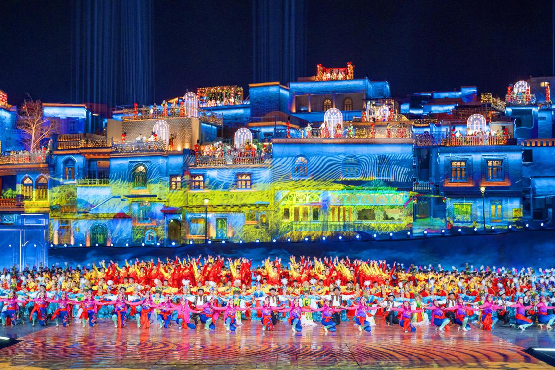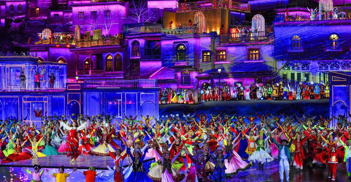 新时代以来,新疆的文艺事业得到前所未有的发展和繁荣,优秀民族文化与时代同频,成为创造性转化与创新性发展的典范。晚会通过具有地域和民族特色的舞台道具,将民族元素与时代元素有机融合,突显中华民族文化形象,提升了春晚的艺术性和时尚感,打造出赋予中国美学追求的时尚民族风。歌舞乐《祖国颂—我的爱献给祖国母亲》在融入现代时尚音乐元素的十二木卡姆乐曲的伴奏下,各种民族乐器,库姆孜、马头琴、冬不拉、都塔尔、唢呐等齐上阵,奏响了中华民族一家亲的和美乐章,共同表达新疆各族人民对祖国、对家乡的至爱情感。《红红火火过大年》龙狮表演与民族歌舞同台竞艺,大头娃娃等节日元素强化了“欢乐吉祥、喜气洋洋”的主基调。几百位演员整齐舞动的石榴花瓣,组成了石榴花的海洋,蕴含各族人民像石榴籽一样紧紧抱在一起血脉相连。晚会既包含各民族优秀传统文化精粹,又兼具现代思维和时代气息。