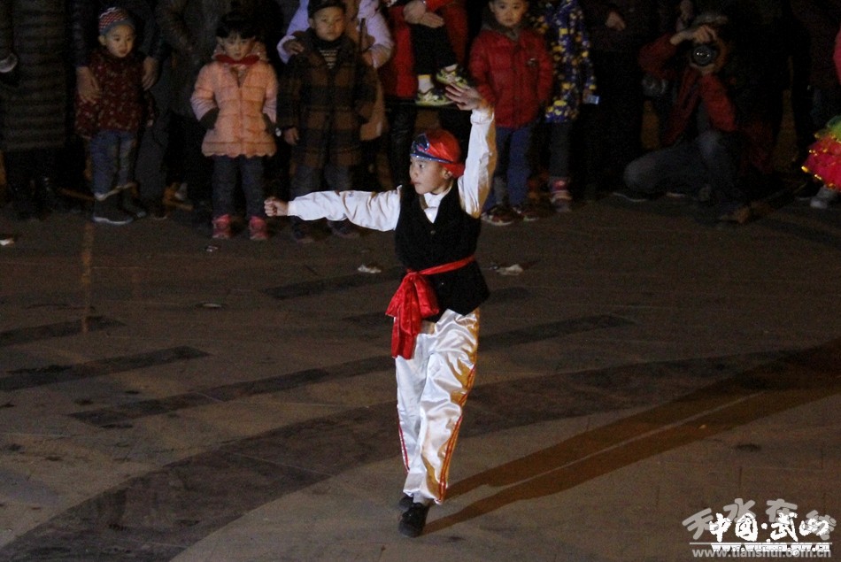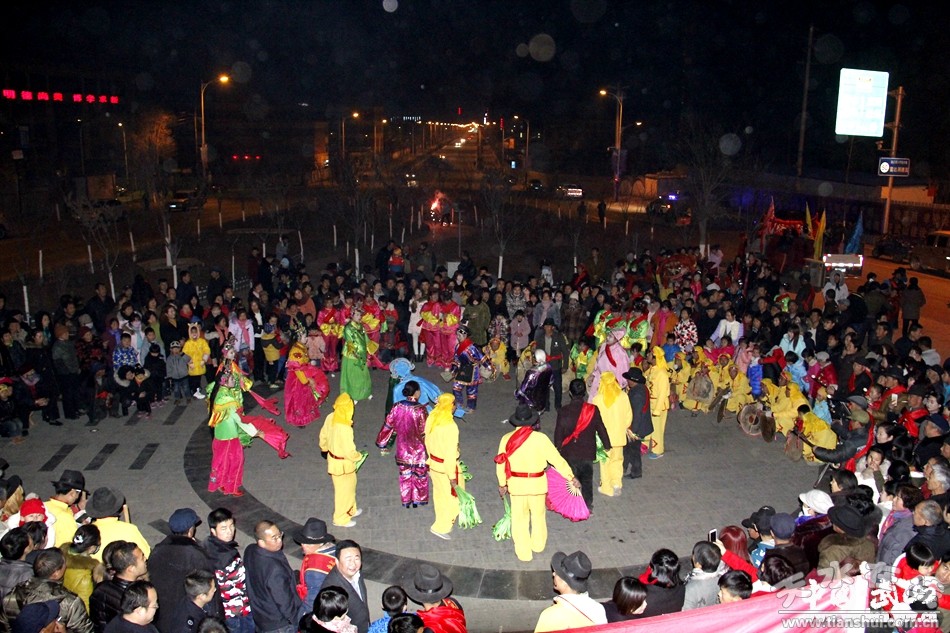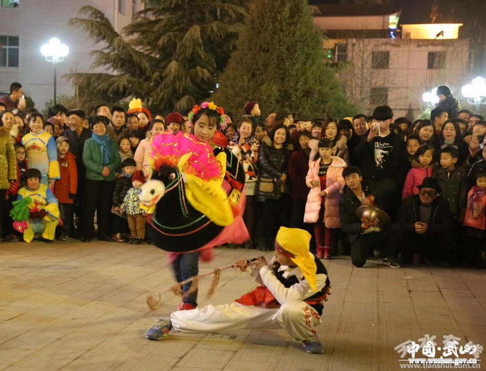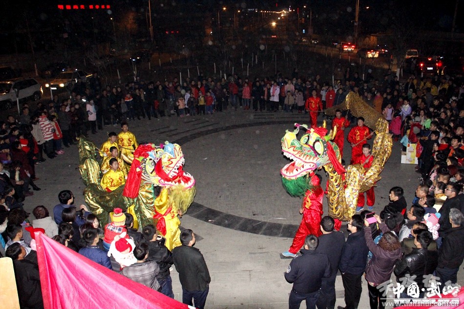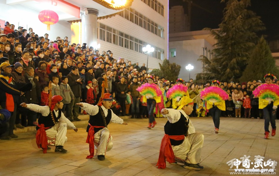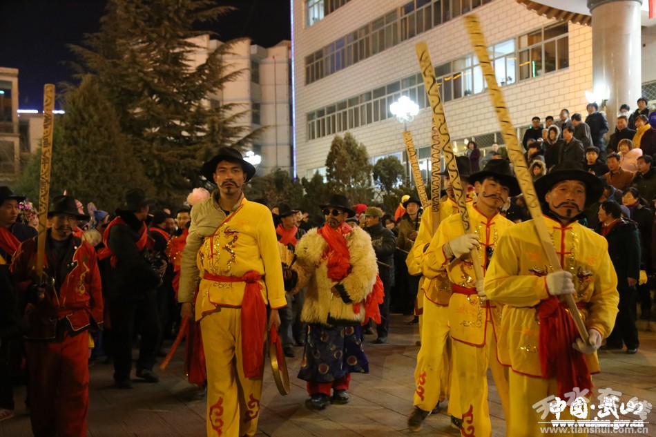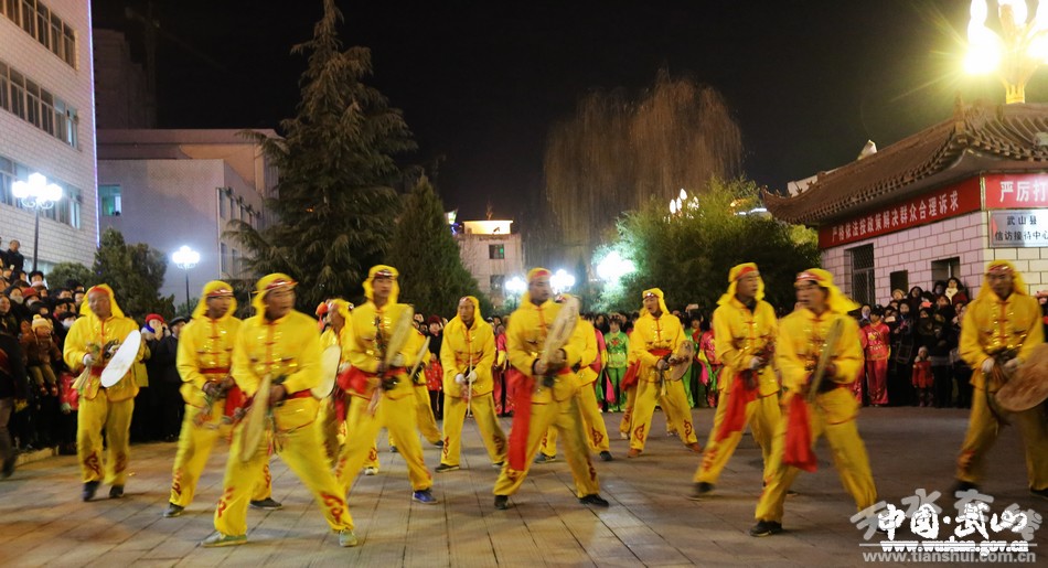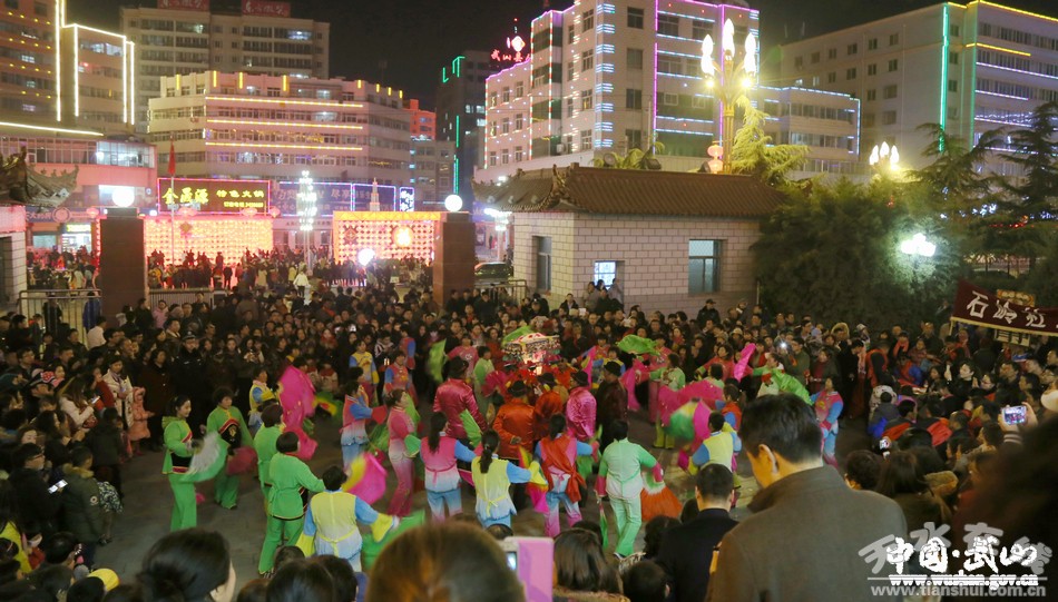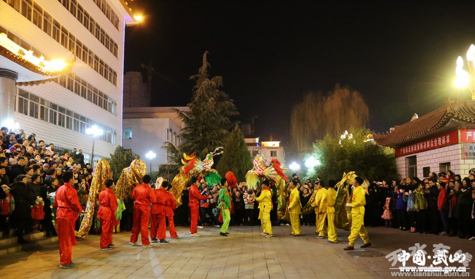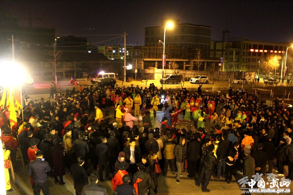 晚上八时许,来自滩歌镇罗庄村、洛门镇石岭村、城关镇红沟村的社火表演队走进县城,在宁远广场、群众文化中心和风云雷雨坛广场进行社火表演,向全县人民拜年。整个武山县城呈现出一片锣鼓喧天,人山人海的热闹景象。