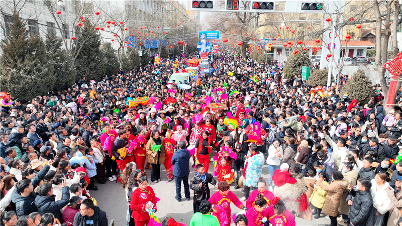 正月十五早上十点刚过,街上早已人山人海,由群众自发组织的社火伴随着锣鼓声在沿街舞动,赢得了沿街观看群众驻足观赏,让年味儿更醇厚。