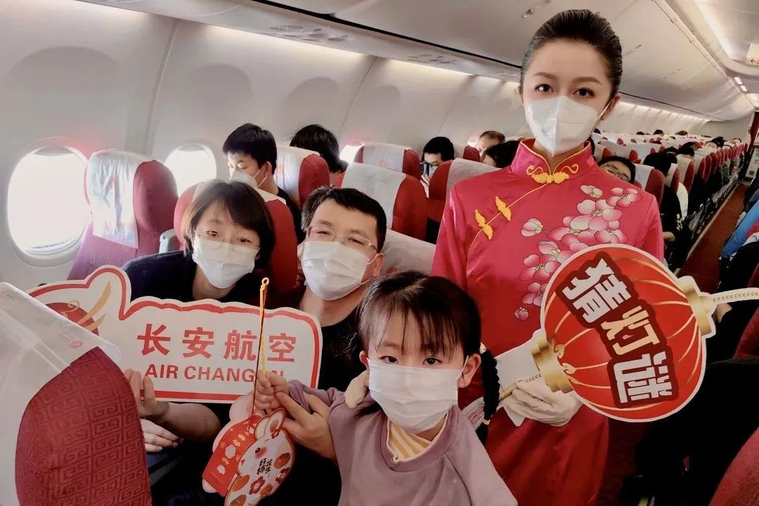 为使在外奔波的旅客感受到浓浓的节日氛围,长安航空在由哈尔滨飞往西安的9H8366航班上开展“张灯结彩过十五,欢天喜地庆元宵”主题航班活动。“长安花”乘务组精心布置客舱,邀请旅客猜灯谜,并送上精心准备的福兔灯笼,在万米高空向旅客送上吉祥团圆的美好祝福。