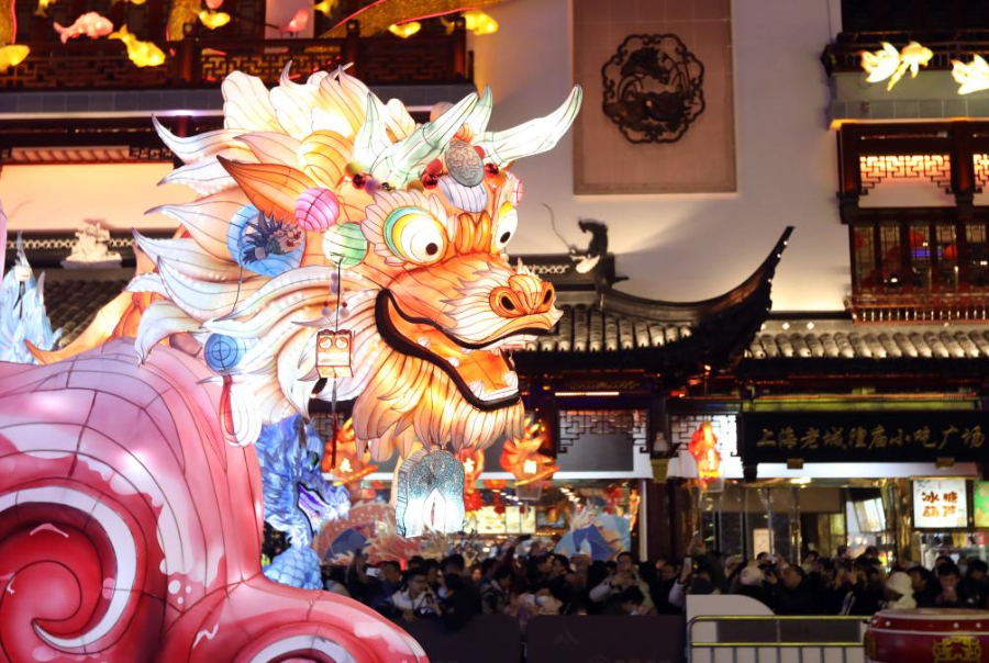 在四川自贡,3万多名游客走进“中国灯城”自贡中华彩灯大世界,观彩灯、赏演艺、拍全家福。空中,600架无人机排列出汤圆、舞龙灯等图样;地面,舞龙舞狮等民俗表演轮番上演,上百名身着汉服的演员手提花灯巡游……