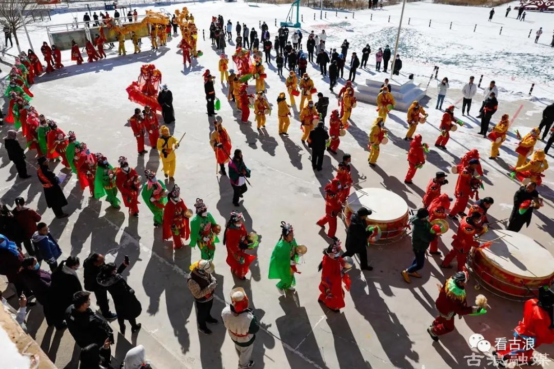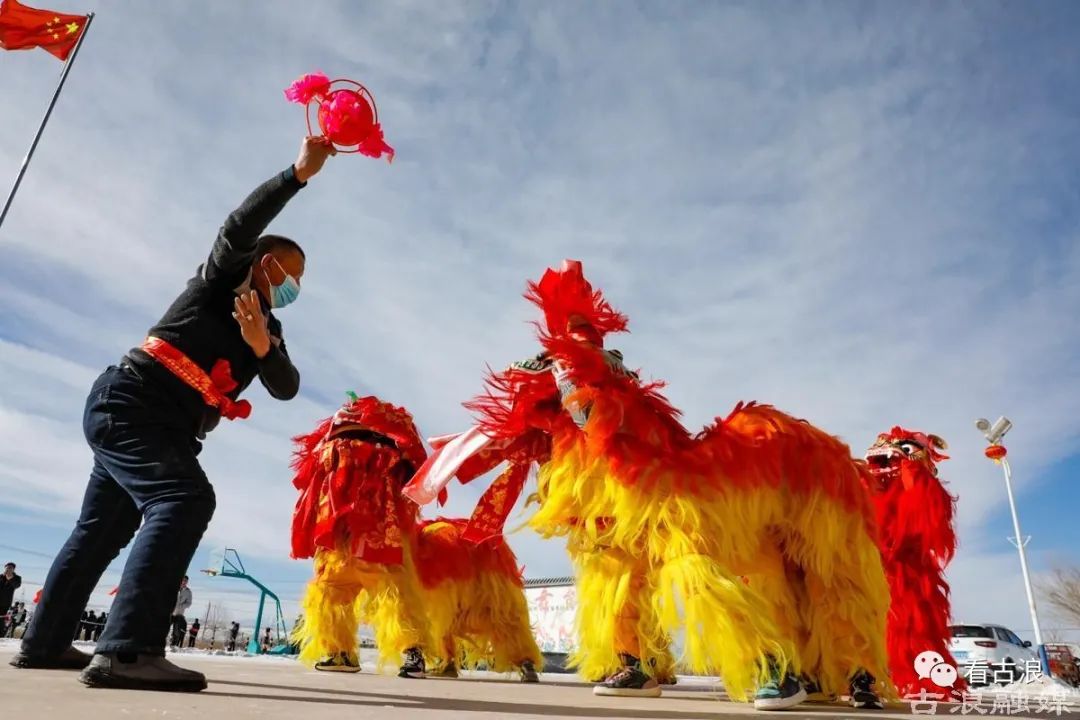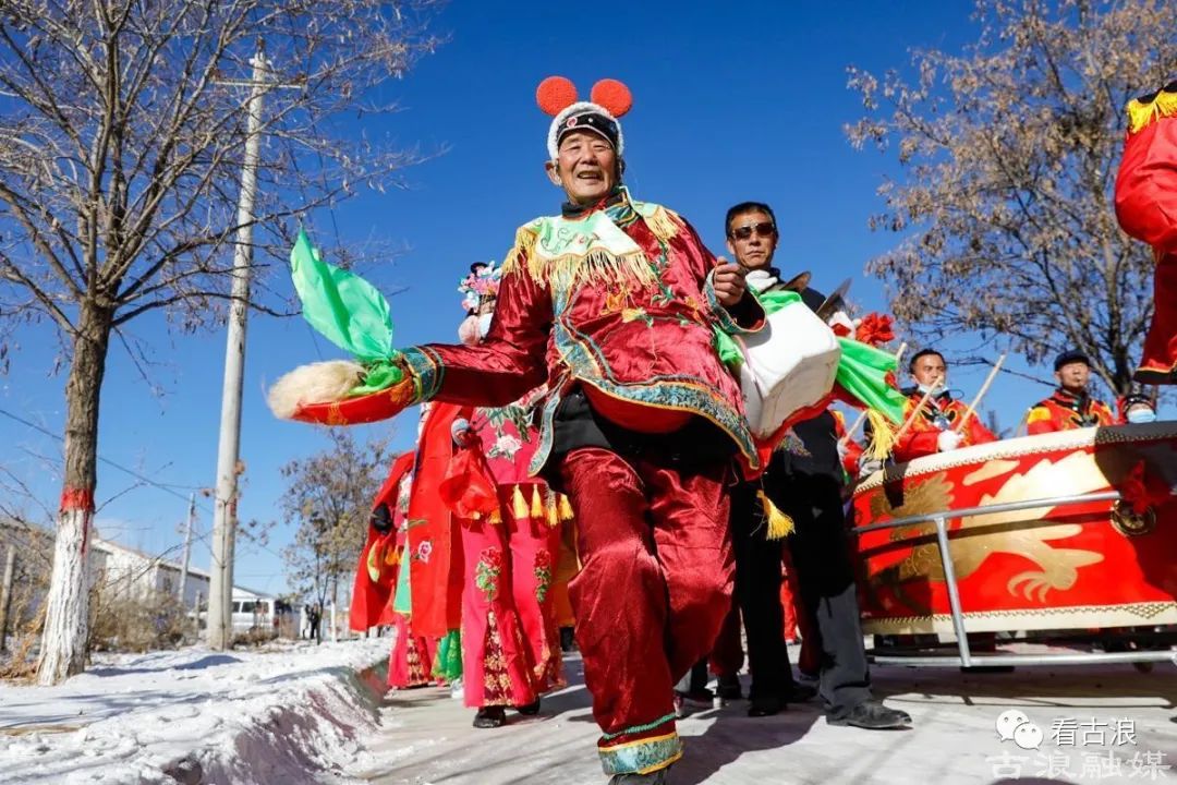1月24日,古浪县西靖镇惠民新村整齐划一的巷道里充满了浓浓的春节年味。社火队员们身着盛装,春官老爷、憨态可掬的大头娃娃、孙悟空,锣鼓、旱船、耍狮子等全部登场,哨声不断,鼓点激越响彻云霄。社火表演队的队员们个个精神抖擞、神采飞扬,把新春的祝福送到家家户户。