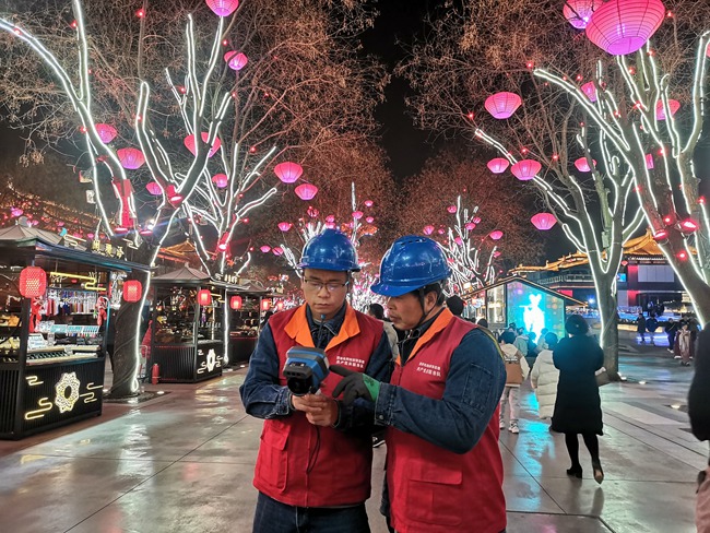 华灯初上,游人如织。“元宵节期间,我们必须要加强巡查,确保保电工作万无一失。”2月2日,在对西安城墙灯展用电设备开展夜巡前,国网西安市区供电公司永兴中心供电所李宗晟向保电人员交代巡视事项。