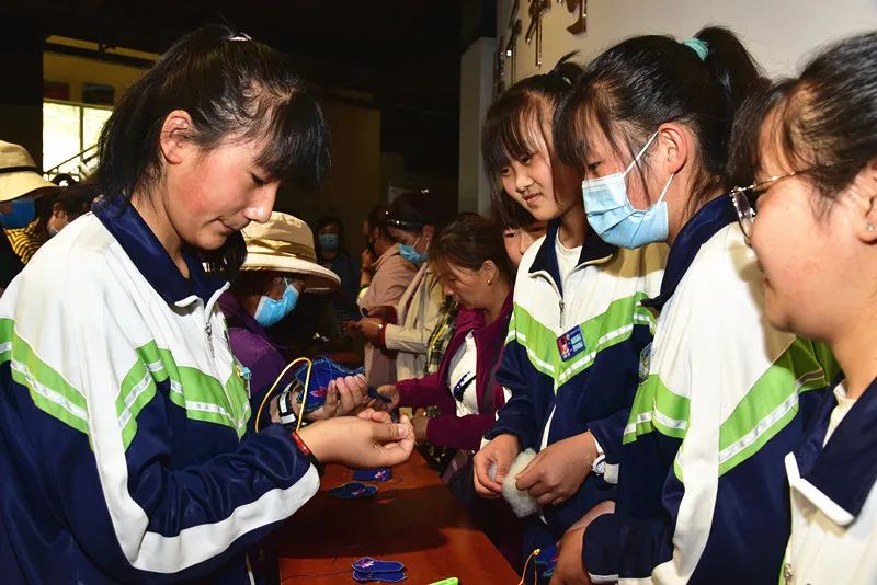 参与体验的队伍中,一支特殊的团队引起了人们的注意。来自甘河滩镇班沙尔学校的6名学生相互配合,熟练地飞针走线制作荷包。带队老师董有生说,“学校有青绣兴趣班,学生们挺喜欢,今天借青绣展暨荷包节的平台,让学生增长见识。”