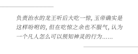 负责治水的龙王听后大吃一惊,玉帝确实是这样吩咐的,但在吃惊之余也不服气,认为一个凡人怎么可以预知神灵的行为。就将降雨量颠倒了一下,城内下七分城外下三分。结果城内发生了水灾,房屋倒塌,淹死了不少人,玉帝知道后下令将金龙砍成了九节。
