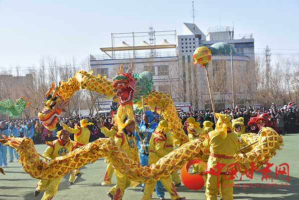 喧天的锣鼓、起舞的雄狮,喜庆的秧歌,盘旋的巨龙,欢腾的藏舞,接连上演,呈现出一派“龙腾贺新春、狮跃大发展”的热闹景象,传递着瓜州儿女的吉祥与欢乐,丰收与希望,祝福与心愿。瓜州城乡民众纷纷涌上街头,争相一睹新年民俗“文化大餐”的精彩盛况,共同感受新春的欢愉和传统的“年味”。   “今天是元宵节,过年的最后一天,我们全家人都过来看社火,今年的社火也挺丰富的,又是高跷又是秧歌,挺好的。”市民陈梅芳说。