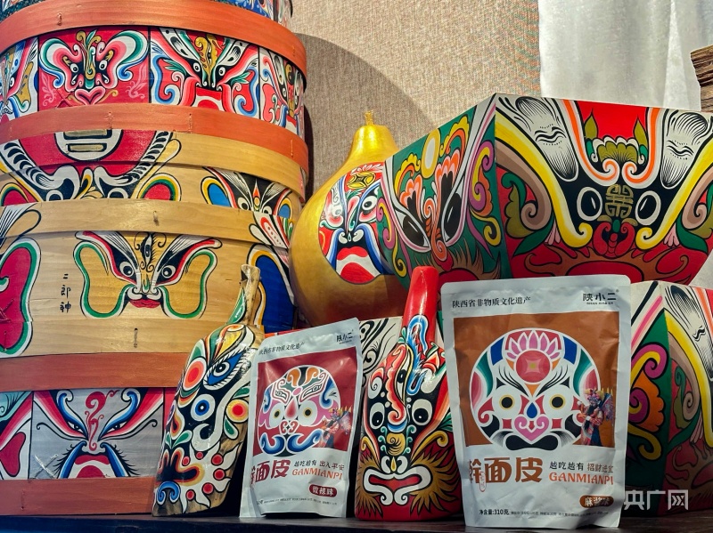 “我们最近将社火脸谱与宝鸡特色美食擀面皮结合起来,联合面皮生产企业推出了祈福纳祥、招财进宝、镇宅辟邪、出入平安四款产品,将社火脸谱《封神榜》中的特色形象融入其中,沿袭了传统非遗象征的美好寓意,消费者可以根据口味喜好自行选择。”薛亚兵说,该系列产品上市后迅速“走红”市场,目前直播间每日平均售出一千件。