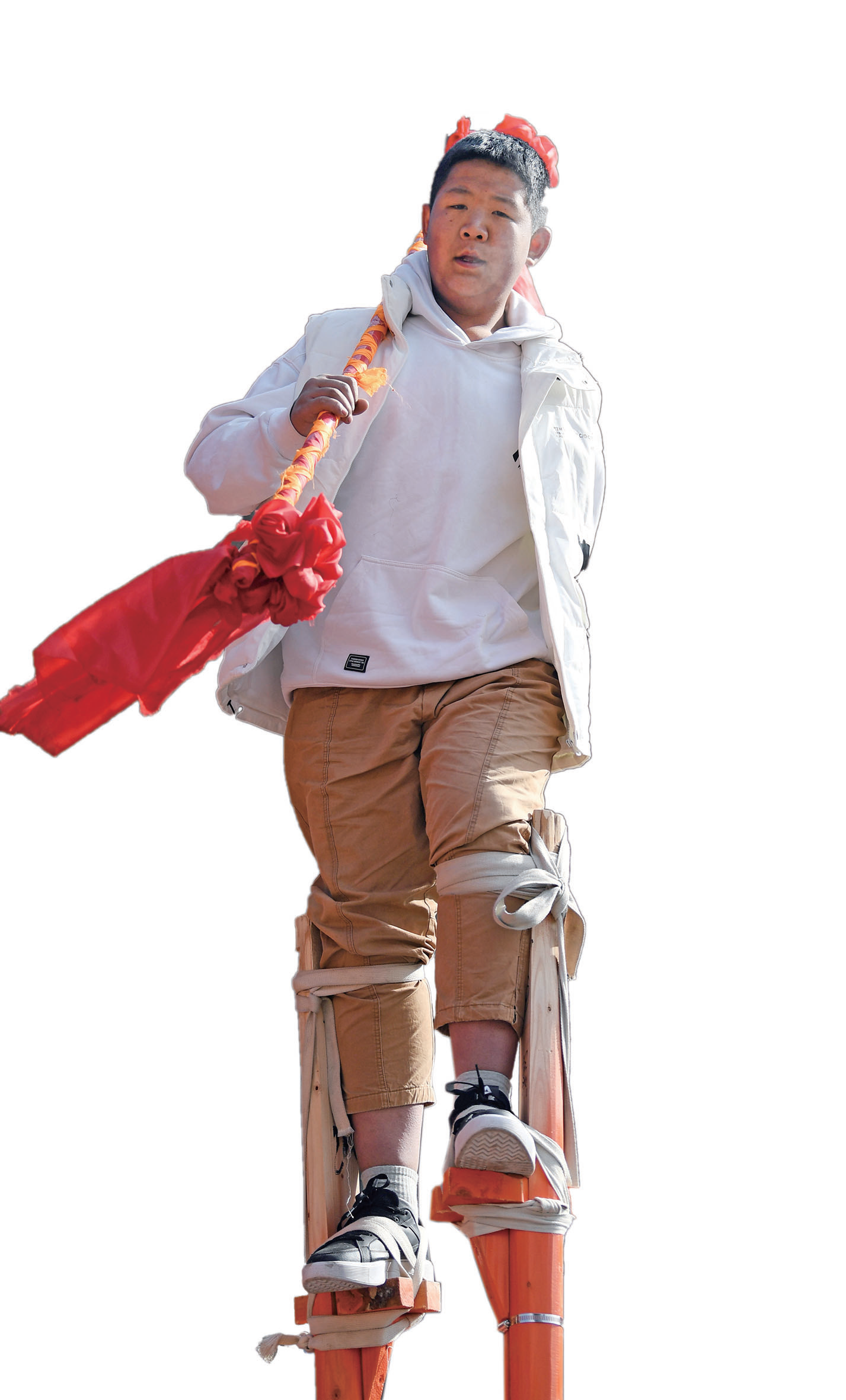 与此同时,鲁沙尔镇的小伙子们踩着两三米高的高跷,伴着“咚咚”的鼓声,正卖力地练习社火曲目。队伍中,22岁的张福臻踩着3.6米的高跷在场地内来回穿梭。张福臻表演高跷已经有7年了,多年来,他踩的高跷一年比一年高,如今已成为整个高跷队的“第一高”。
