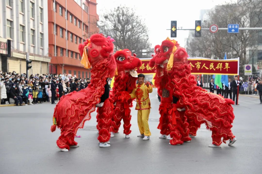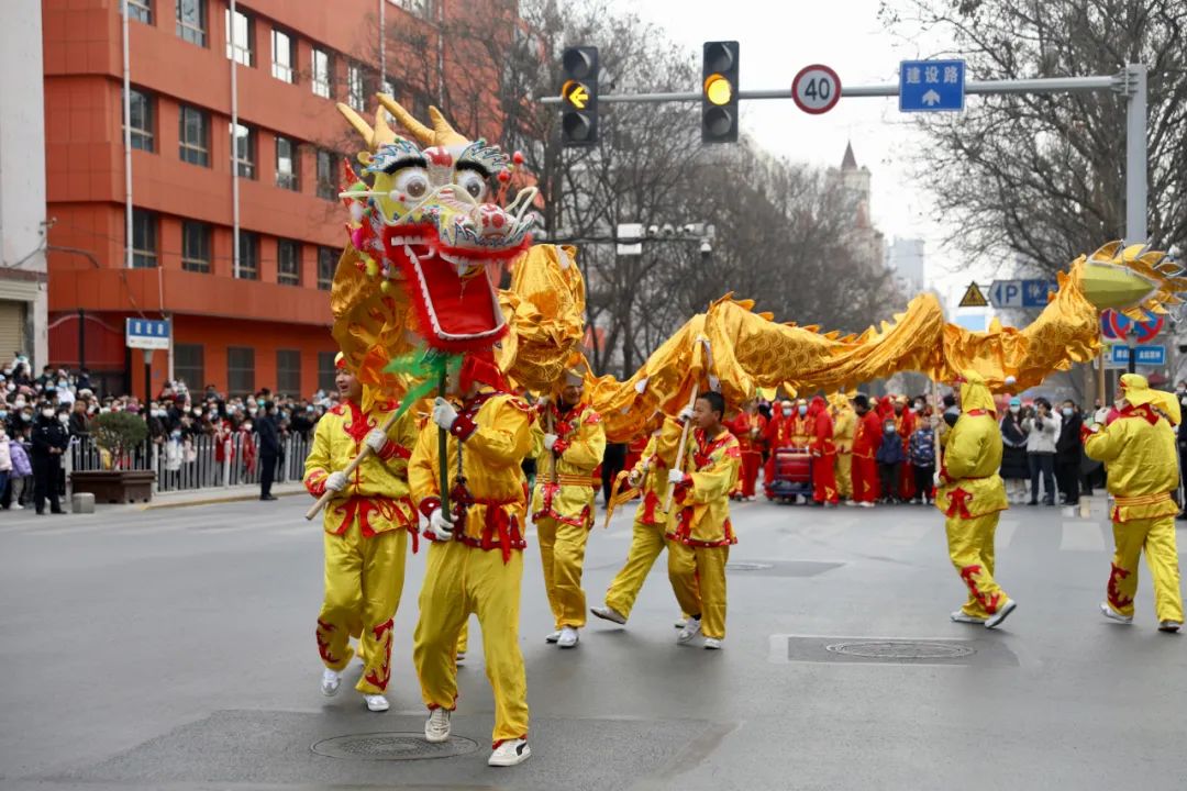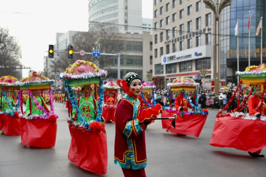 他们扭秧歌、舞长龙、耍狮子、划旱船、踩高跷,合着锣鼓的节奏,扭着摇曳的舞步尽情地表演着。