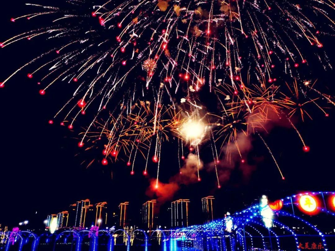 此刻,诗在云影中留连,画在夜色中闪现,曲在天空中奏鸣!不同色彩的烟花组成诗的意境,把人们带到了一幅欢天喜地庆佳节的画境中,传递着兔年新年的喜悦与幸福,也寄托着人们心中红红火火的新春期盼。