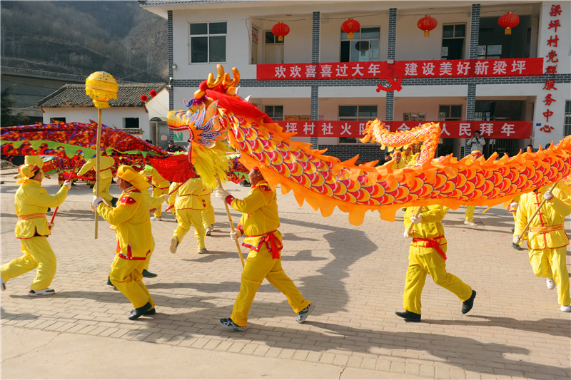 大山环绕的梁坪村,在社火的映衬下显得极为喜庆祥和。当天的演出活动中,社火队为广大群众表演了舞龙狂狮、民间社火划旱船、秧歌队广场舞、武术等一系列当地传统社火节目,为浓浓的年味增添了节日气氛。