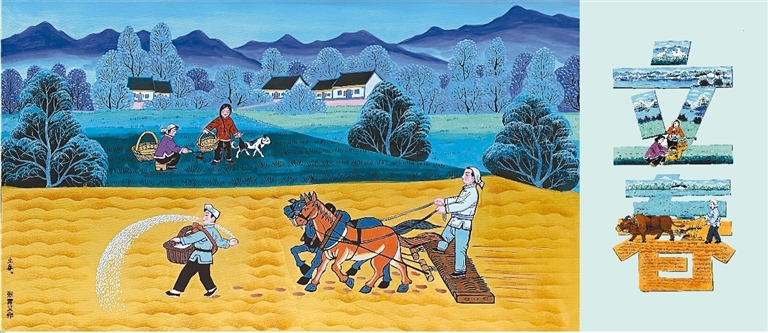 在他创作的一幅专门表现立春时节农耕生活的画面中,远处的山峦与天色相互映衬,环绕村庄的树木上似乎还挂着雪花和冰凌,而田里的麦苗已经苏醒,农妇在其间挖着野菜,人们已开始忙碌,施放肥料、耙耱土地……整个画面显得静谧而又生机勃勃。