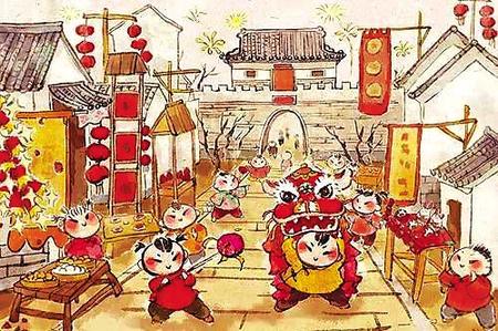 转眼到了大年三十,俗称“除夕”,黑河流域除旧迎新的主要活动,都集中在这一天进行。父亲一大早就带我们揭去墙上的旧画,贴上新买的年画;窗户蒙上新纸,贴上母亲亲手剪的窗花。母亲勤劳淳朴心灵手巧,剪出的窗花有“孙猴子摘桃”“孔雀嬉牡丹”,特别是小猪、小狗、小老虎图案,栩栩如生活灵活现。做完这一切,已经到了晌午时分,父亲便急急忙忙带我们贴春联、贴门神。父亲说门神是守护门庭的卫士,左边贴“白脸儿”,右边贴“黑脸儿”,象征财源广进家道平安。我们将一副秦琼和尉迟恭的门神,端端正正贴上庄门扇,满院子红红的对联,满屋子崭新的年画和窗户上鲜艳的窗花,为节日披上了盛装,喜气洋洋。
