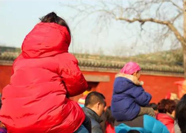庙会上,孩子们都被大人放在肩头,看着路边好吃的好玩的,什么都想要。