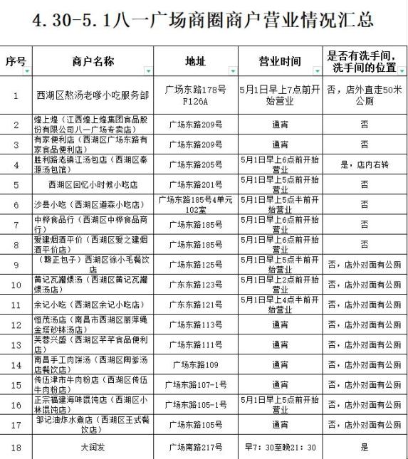 此外,5月1日当天,武商广场1号门6点摆摊早市,提供武商超市面包馒头牛奶泡面等快餐食品。商场负一楼食通天6点半开业。