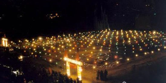 365盏(闰年另加30盏),一盏灯一天,象征一年 365天。灯场中心,栽一根高达七至十米的“老杆”,上面挂有大灯笼,并置有烟火,等待点燃。灯场外面有许多用块炭垒砌成的圆锥形的“旺火”,夜间点燃,火光冲天,供游人观赏和取暖,为灯场不可缺少的陪衬。
