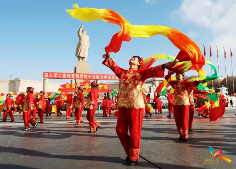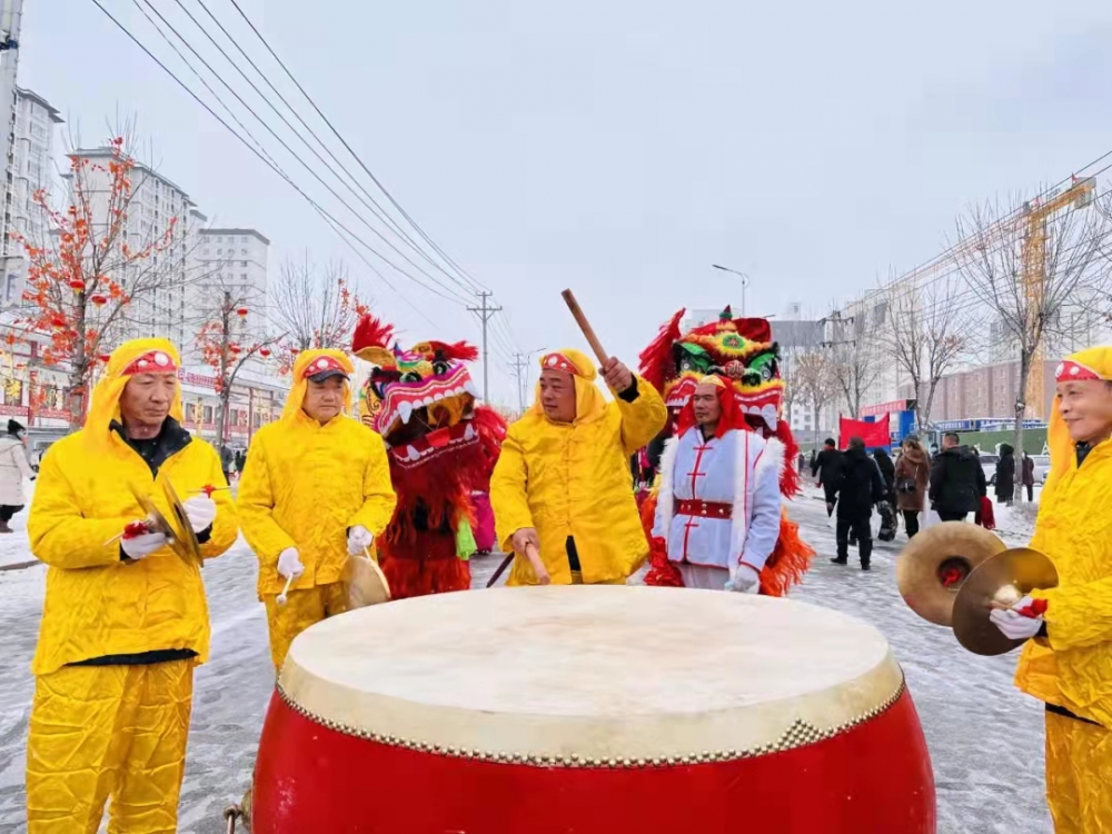 2月15日上午 ,乌鲁木齐人民广场表演威风锣鼓。(记者陈星宇摄)