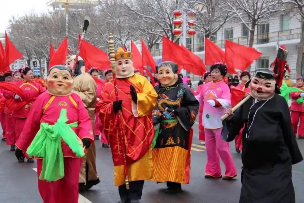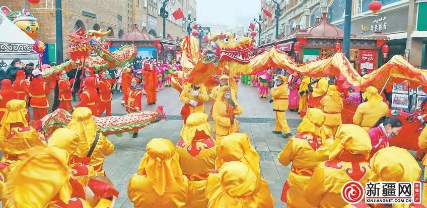 在乌苏市中心,锣鼓声中舞龙舞狮以及红男绿女的秧歌表演,将欢乐喜庆撒遍街头巷尾,身着彩装的大头娃娃形象可爱,不停地卖萌讨喜,引来人们的阵阵欢笑。