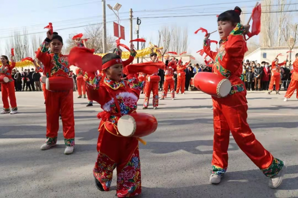 2月15日,在乌什县依麻木镇欢庆的社火表演中,各族小朋友身着传统的喜庆红装,有模有样地打起腰鼓敲起锣,舞龙、舞狮、跑驴、扭秧歌等社火项目,把小镇带入了欢乐的海洋。