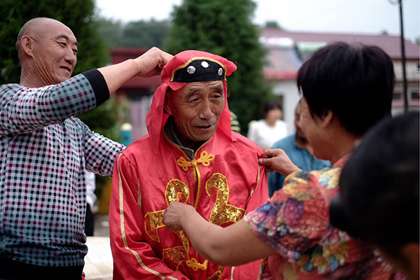记者在韩沟村见到了国家级非物质文化遗产传承人韩富林,这位老人是毋庸置疑的领袖。这天清晨在村里开敞的平地上,一群带狰狞面具的舞者静静守候他,他当众穿上了舞蹈服装,准备擂响第一声大鼓。