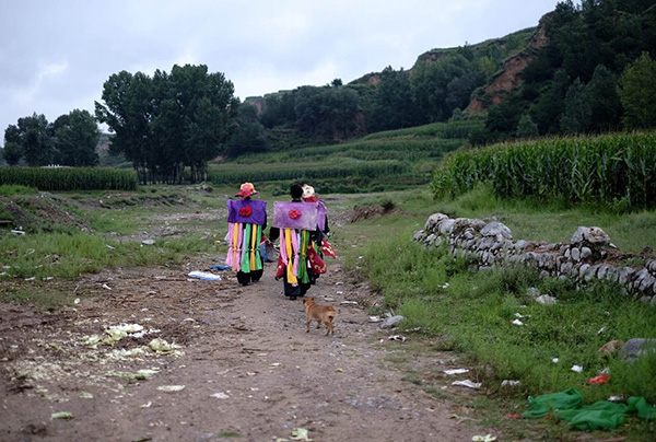 三位舞者走在乡间土路上。本文图片均为 澎湃新闻记者 李丹 图