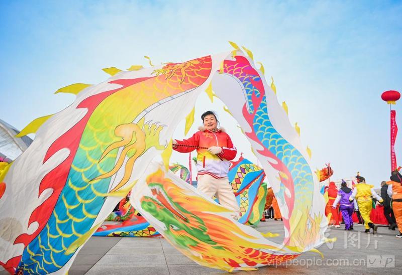 2024年2月24日,在新疆昌吉回族自治州呼图壁县第三十二届秧歌社火表演赛活动现场,演员在表演舞龙。