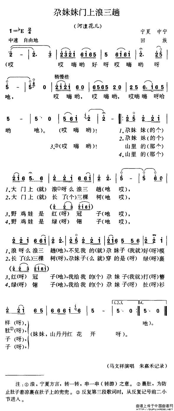 曲谱介绍:这是一首宁夏回族的花儿。这首“花儿”的词曲既保留了甘、青“河湟花儿”的基本特征,又有了一些变化。