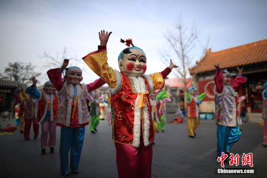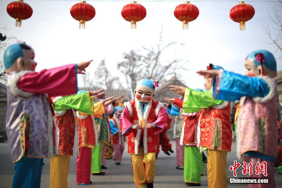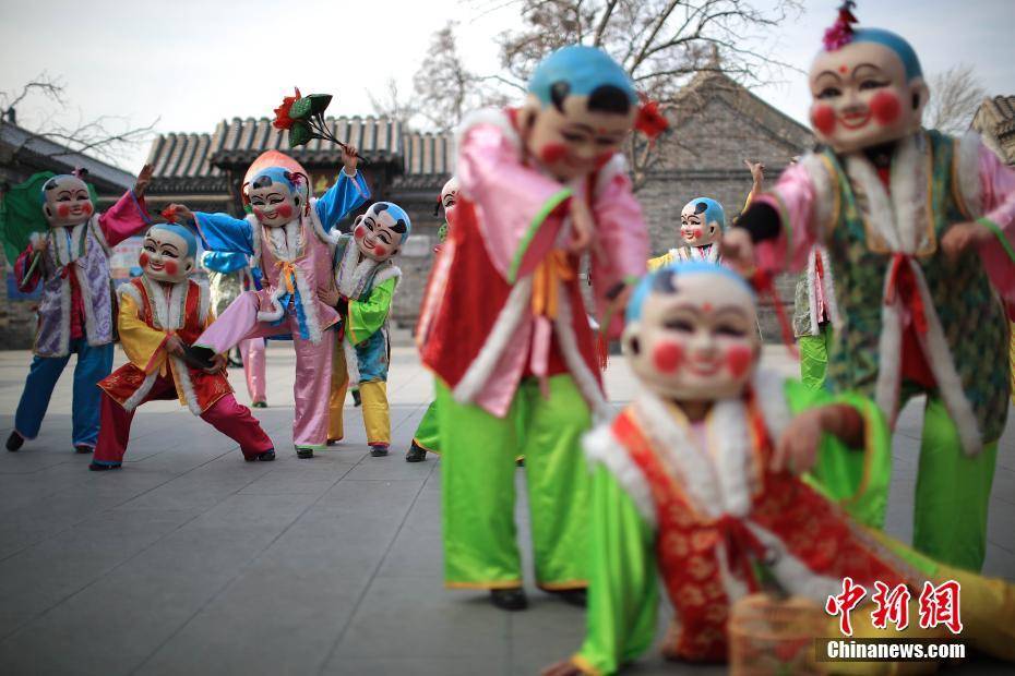 2月8日,天津杨柳青镇,年画舞队在表演中,传统的大头娃娃“走”下了年画,舞出民俗之美。当天,第十五届西青区民俗文化旅游节正式拉开帷幕。