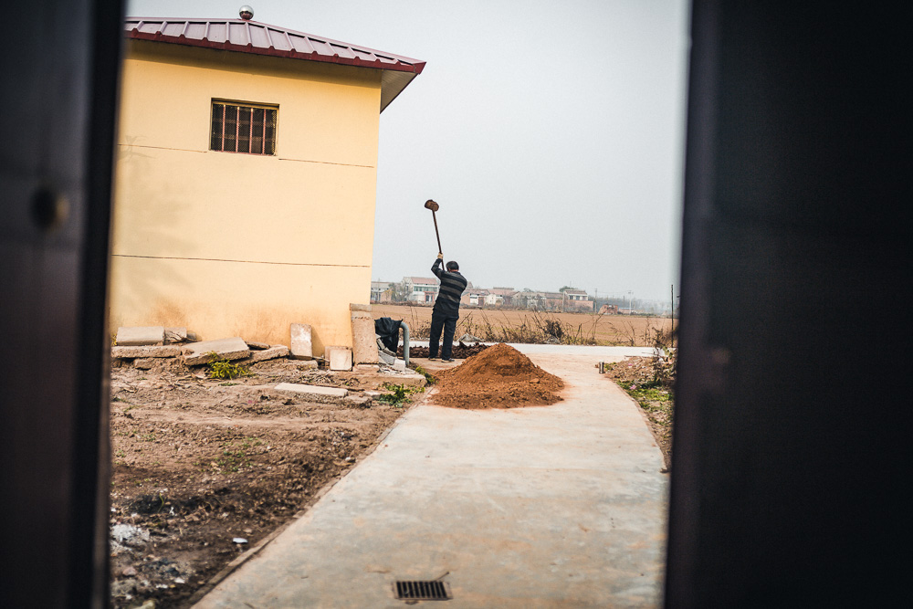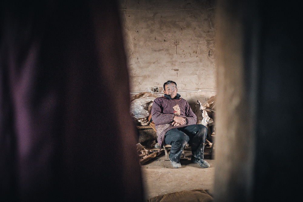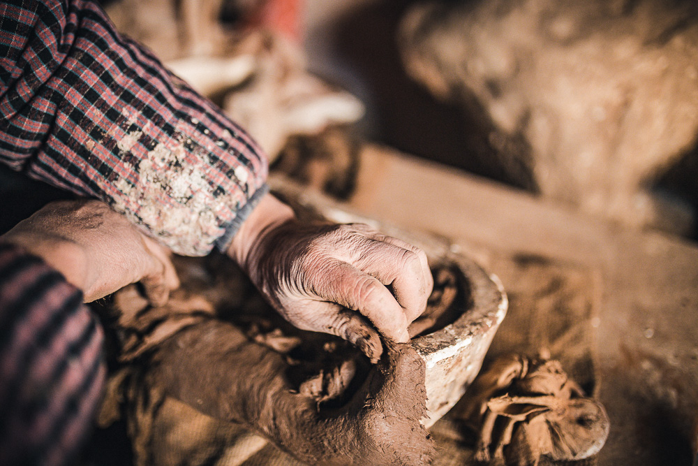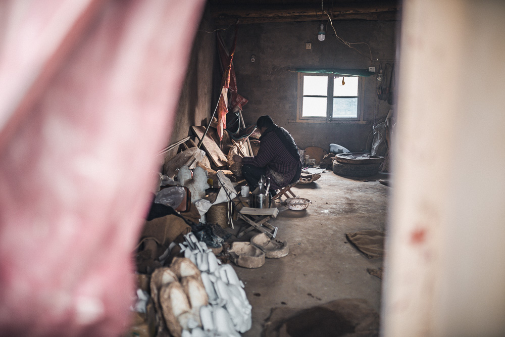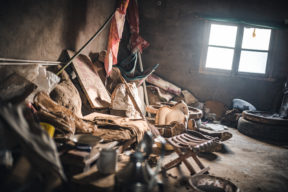 在屋子的后院正在“砸泥”的便是胡永露的弟弟,六合村附近的土叫观音土,非常适合做泥塑,因为土里没有任何杂质很纯净还有一定的油性。这样的土取回来以后会让他自然晒干。水和土会用一定比例混合,然后用锤子打压做成泥胚,这一步叫砸泥,是做泥塑的第一步。
