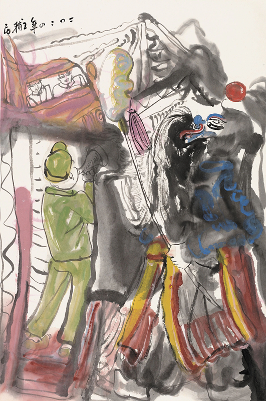 在现代性绘画的探索中,如何汲取传统因素非常重要。如毕加索的现代性观念是从非洲雕刻中转化而来,这种创作方法能否给中国画家以启发,是新世纪以来艺术家思考最多的问题。王辅民即是以这种创作思路来探索和挖掘中国画的现代性,因此,他选择取材于西北甘肃一代的民俗风情。社火是在传统节庆时节,带上面具、穿上戏服、上街游走的一种狂欢行为,也是一种祭天、祭地、祭神的仪式,是为了祛邪辟恶、保佑一年五谷丰登的祭祀活动。毫无疑问,社火活动带有一定的神秘诡异色彩,而王辅民作品的现代性就体现在神秘性上,并与原始社会聚会扮兽庆贺中所体现的人的意识紧密相联。所以,他的作品内涵并非是通过画面的平面构成和形式语言来表达现代人的视觉经验,而是在追求的神秘意识中把对人的表现以及传统文人画的笔墨有机结合。因此,王辅民的创作和探索方向即是在这两者之间寻找平衡,这也是他在艺术追求上的基本立意与思考。当然,在具体的创作过程中,如何表现社火活动中穿着戏服的人物形象,我认为王辅民画得十分巧妙。他的作品具有强烈的现代感,有效地改变了我们的视觉经验,图像内容表面上看是带着夸张或放大面具的人像,而实际上则是把现实中的人物画成了戏剧中的人物,或是把现实中的人物和戏剧中的鬼神结合起来,以致我们在日常生活中看到的人物形象和生活形态,都与他在社火中表现的人、鬼、神之间构成了一种特有的对应关系,使得画面中蕴含了一种深刻的哲学意味。王辅民的笔墨既追求传统文人绘画的潇洒逸度,又追求毕加索描绘非洲雕刻时出于偶然的荒诞与变形,致使他的画面中形成了一种离奇与精致、粗放与细微的强烈对比,有效地传递了现实与非现实、人与鬼神之间的意识变换,实现了现代性绘画的释放与突破。