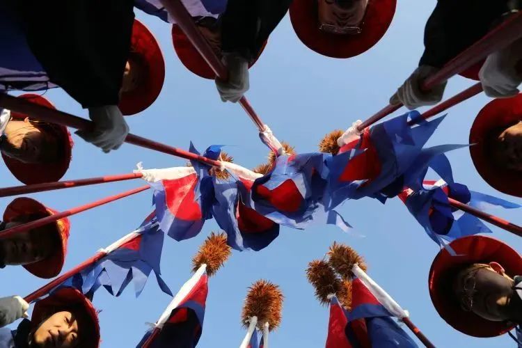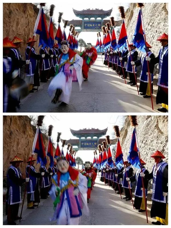 旗手们头戴红缨鞑帽、身穿长袍彩服,随着会首的方位变化,口中不时地发出“好好呀呀、好好呀呀”的喝声。锣鼓奏“舞会”音乐。