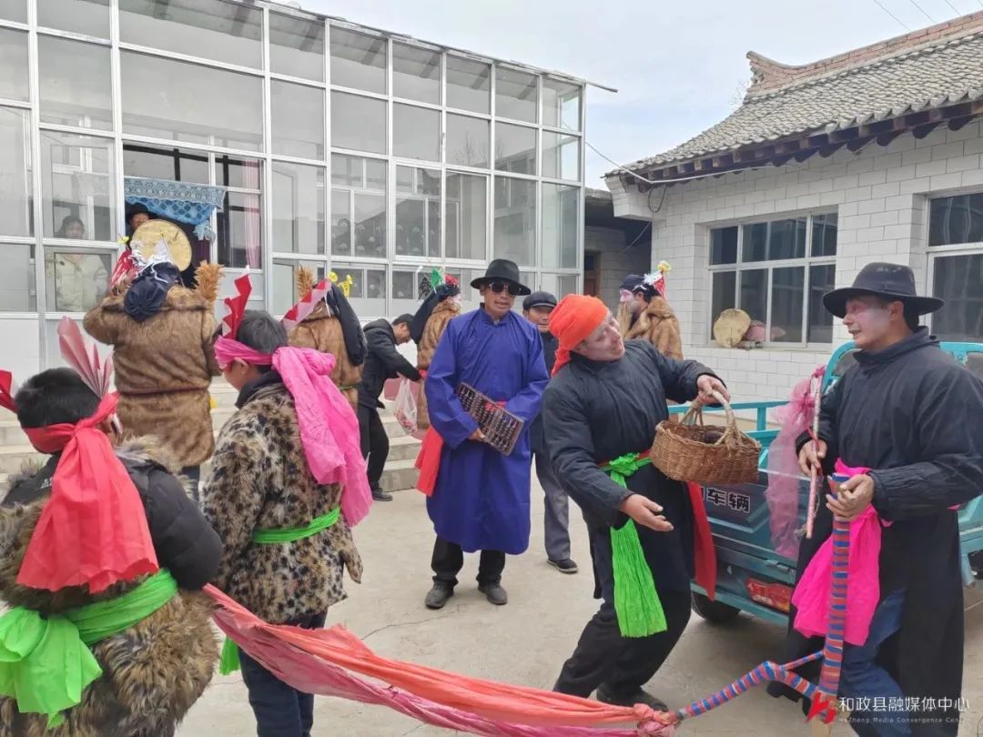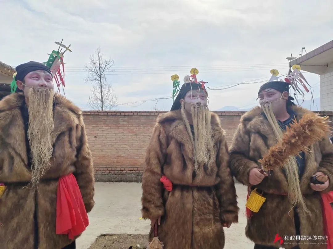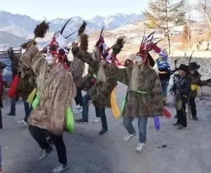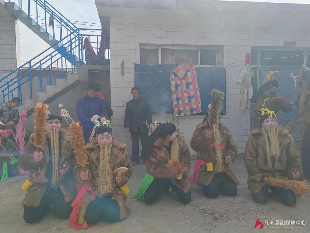 新春佳节,来到和政县牙塘村牙洒沟社时,就能看到这里精彩的“牛犊爷”表演。只见“录巴”、“白法师”、“使者”、“喜神”、“先生”、“庄稼佬”等扮相的群众,手执鸡毛掸子、柳罩、笔墨、木犁、羊皮鼓等多种道具,挨家逐户,为全村群众送去祝福。看到表演牛犊爷的演职人员来到了家里,村民们个个喜笑颜开,热情的拿出提前备好的美酒、糖果进行招待,以表达对“牛犊爷”的崇敬爱戴之情。由于牛犊爷表演平时很难看到,所以此次表演吸引了周边广大的民俗文化爱好者及群众前来观看,大家纷纷用手机、单反记录牛犊爷非遗的精彩瞬间。演职人员走到哪里,观众就跟到哪里,人们追随民俗文化的执着精神深深感染了观众。