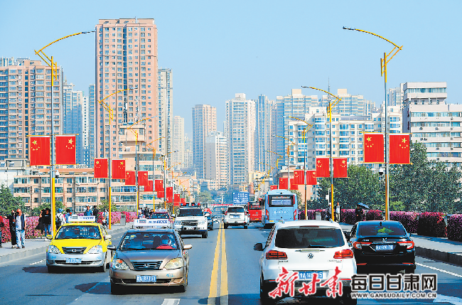 10月1日,兰州市主次干道穿上了“中国红”新装,鲜艳的五星红旗成为兰州街头最美的风景线。新甘肃·甘肃日报记者 盛学卿