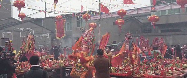 迎神队伍行进途中,居民们夹道欢迎,纷纷燃放炮竹烟花,阖家老幼参香礼拜,各户门前设案张宴,案桌上摆设供品果子,以迎接本境诸神驾临,称为“接宴”。迎神的仪仗犹如官衙排场,如“迎泰山”时以帝王威仪出巡,而“迎大王”则似一般官员出行,礼仪虽然繁琐,但却秩序森然。