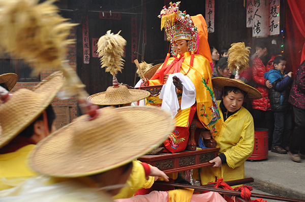 位于新店的战坂村,原安排于年前进行整体拆迁,遭到居民反对,改到元宵过后进行。战坂村的元宵迎神,在正月十四到十六举办三天,出巡仪式中轿班手的黄色笠帽非常有特色,上面插着鸡羽毛,与韩国仪仗队中的武官帽很相似,可能都源自元代的直檐大帽。战坂村的年轻人担心,一旦村落被拆,本村的民俗活动会很难开展下去,也许今年会是最后一次的元宵迎神活动。